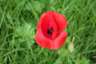 Annuel, moyen, hérissé de poils rudes. Fleurs écarlates, avec souvent des taches noires au centre, anthères noir bleuté, pédoncules à poils étalés. Pousse dans les champs ou les sols remués.