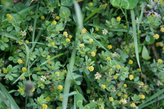 ou de rouge, dents du calice dressées en bouton, angle obtu entre les deux supérieures. gousse droite ne capitule ressemblant à un pied d'oiseau.