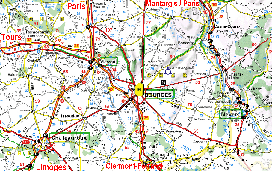 - à 36 km de la sortie n°7 ("Bourges, Nevers, Saint-Florent/Cher") de l'Autoroute A71 [Paris/Orléans/Clermont-Ferrand],