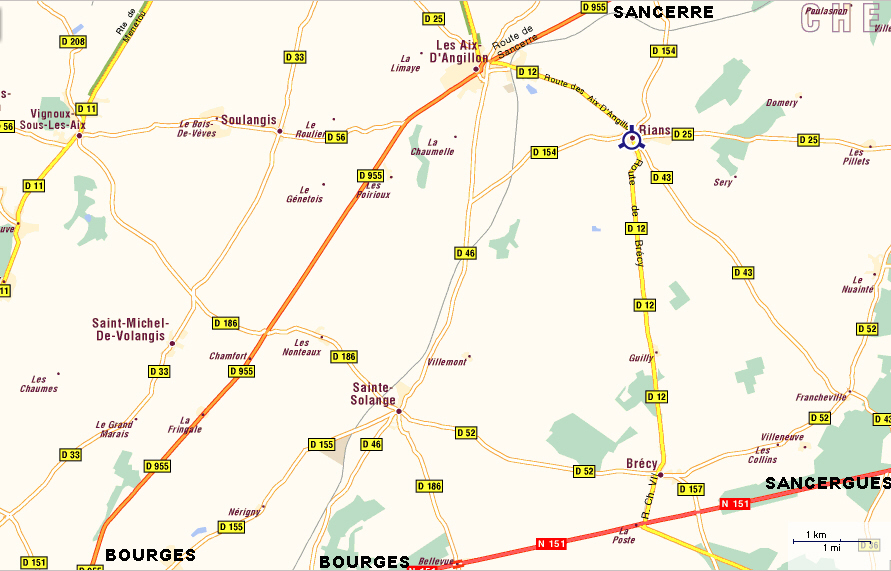 L'accès à Rians peut se faire depuis la RD955 Bourges / Sancerre, par la RD12: Prendre à droite en sortie des Aix d'Angillon, à 23 km de Bourges, et Continuer alors tout droit sur 2 km.